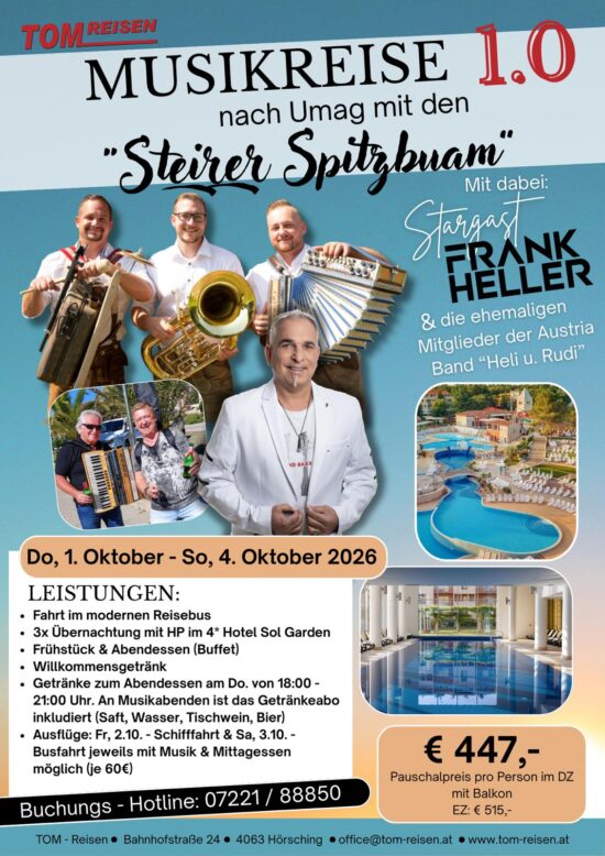 Musikreise 1.0 nach Umag mit den „Steirer Spitzbuam“, Donnerstag, 01.10.2026 – Sonntag, 04.10.2026